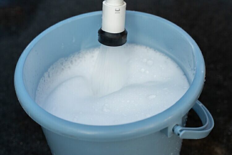 バケツの中に適量入れ、泡立てるように水を入れ希釈してください。